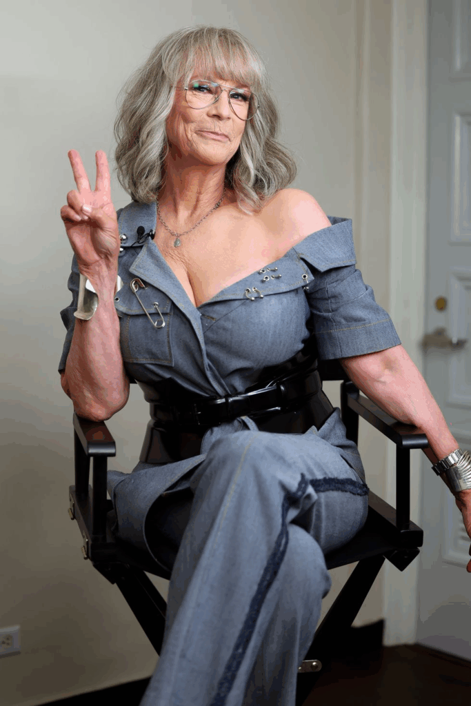 Sin pelos en la lengua, Curtis no duda en oponerse a Donald Trump ni en posicionarse a favor de los derechos de las mujeres y, por supuesto, en contra del edadismo en Hollywood, industria que habita desde que diera los primeros pasos, literales y figurados, al ser hija de dos grandísimas estrellas. De ahí que ni ella ni su personaje teman enfundarse en un arriesgado dos piezas de tejido vaquero y de corte asimétrico. Un diseño arriesgado y de espíritu punk gracias a los imperdibles y piercings que recorrer el top y centran la atención en el generoso escote.
